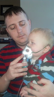 If I remember correctly, we were at the doctors office 5 times in the month of February. They decided to try him on a nebulizer with albuterol breathing treatments and those helped quite a bit! The difference from the start of one to the finish of one treatment was amazing! On day 3 of those treatments, just when we thought he was doing so much better, he began vomiting. And vomited most of the day. A trip to the doctor and we were on our way to the hospital for a blood test to see if he was too dehydrated. (We had been seen on Saturday and this was a Monday - he had lost 10oz in that time span).