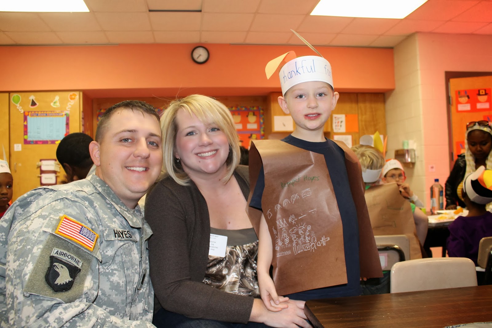 James was even able to get off of work long enough to join us! It was so neat to see all of Kemper's classmates interact and to see how Kemper behaves in his class (although I'm well aware that we weren't getting a true picture since parents were there and I'm sure he behaved a bit differently). As the kindergartners marched down the hall, I noticed their hats and was so excited to see what Kemper had listed as what he was thankful for. We had to stifle a giggle when we got to him and saw what he had listed. Upon asking for clarification, he informed us that he was thankful for the color blue, he was thankful he liked his name (Kemper was written on there), and he was thankful that he was 5 years old.